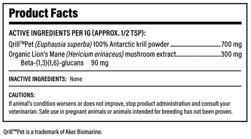 This veterinary-informed blend combines organic Lion’s Mane mushroom extract with Qrill™Pet Antarctic krill in a convenient, meal-topping powder format. Designed to support brain health, digestion, mood, and long-term vitality, this functional formula is easy to administer and highly palatable for pets of all ages.