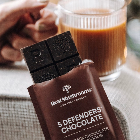 Enjoy one square of chocolate when you want to indulge. Includes 250mg of our 5 Defenders® organic mushroom extract blend per square.