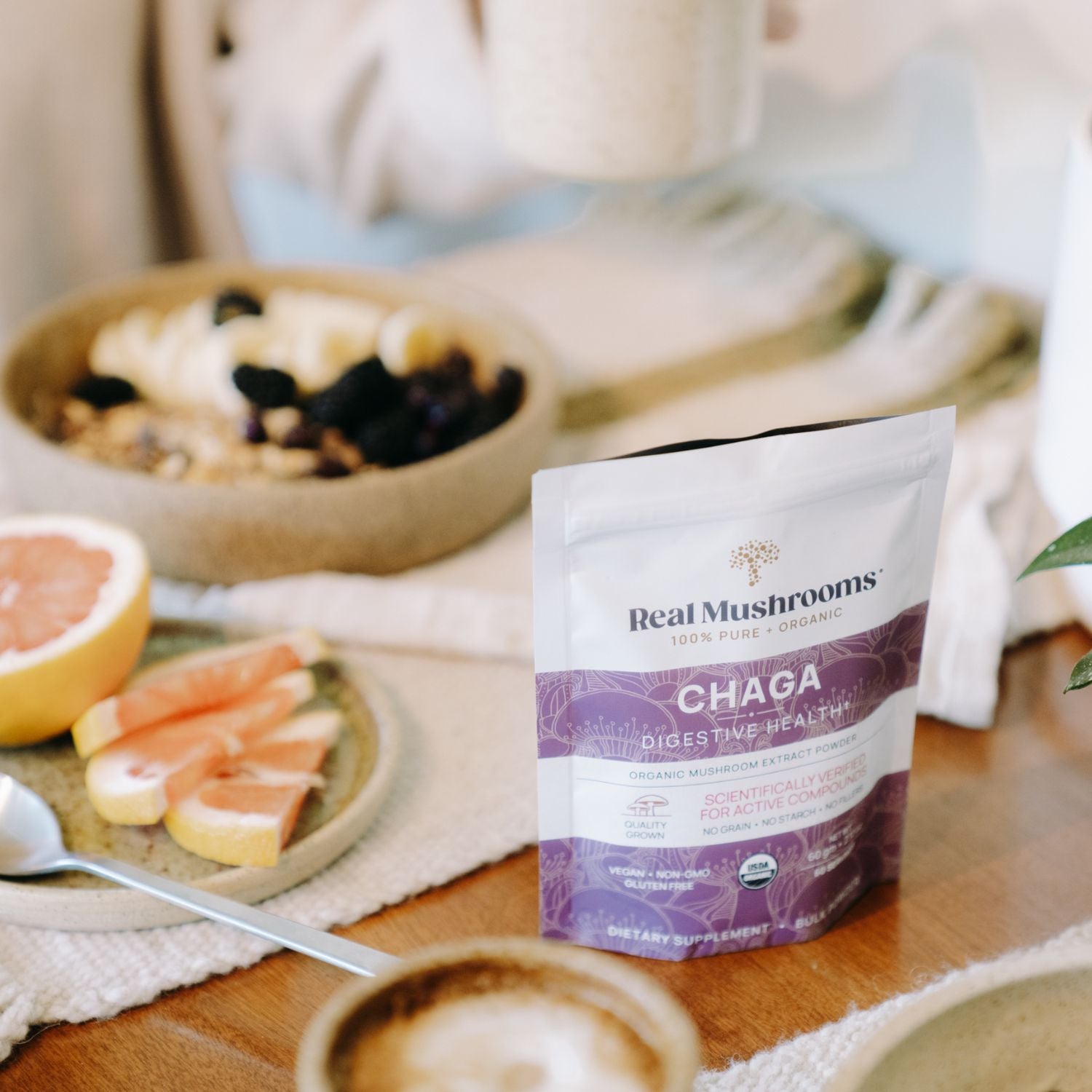 Real Mushrooms Organic Chaga Extract Powder sits beside a bowl of fruit, grapefruit slices, and coffee—an ideal daily immune support boost.