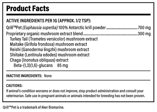 This veterinary-informed blend combines organic mushroom extracts from Reishi, Turkey Tail, Shiitake, Maitake, and Chaga with Qrill™Pet Antarctic krill in a convenient, meal-topping powder format. Designed to support immune resilience, microbiome balance, antioxidant protection, and long-term vitality, this functional formula is easy to administer and highly palatable for pets of all ages.