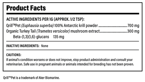 This veterinary-informed blend combines organic Turkey Tail mushroom extract with Qrill™Pet Antarctic krill in a convenient, meal-topping powder format. Designed to support immune resilience, microbiome health, and cellular wellness, this functional formula is easy to administer and highly palatable for pets of all ages.